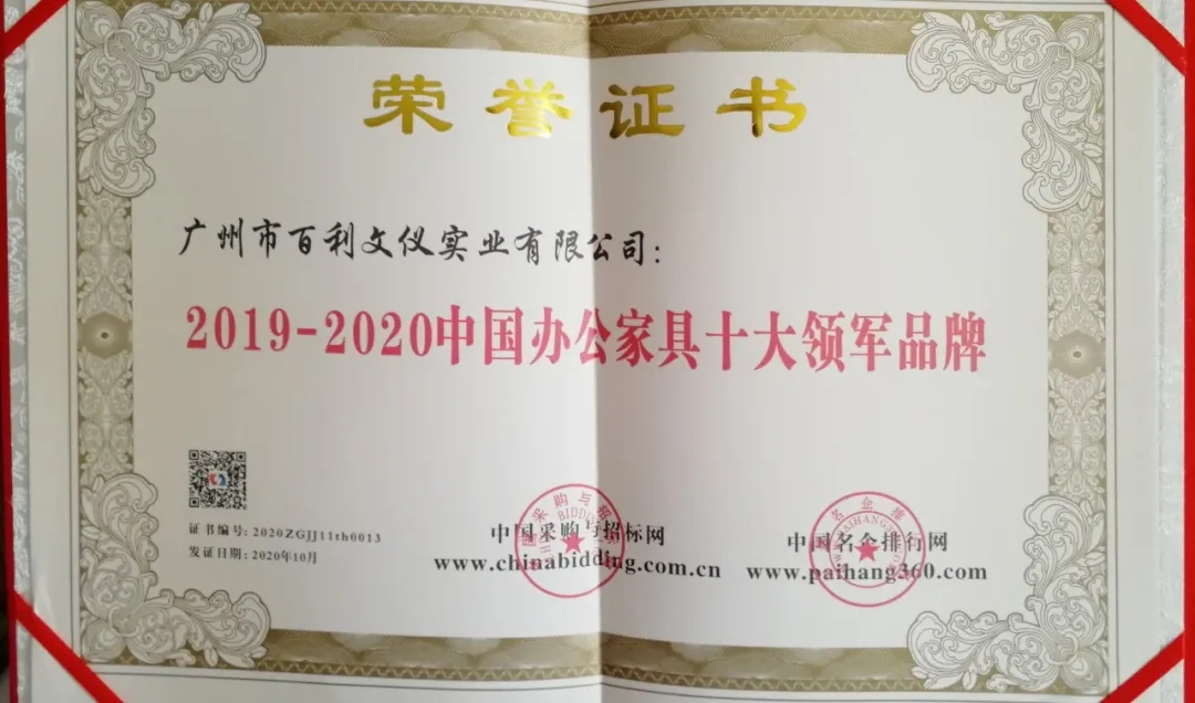 熱烈祝賀百利榮獲中國辦公家具十大領軍品牌等殊榮