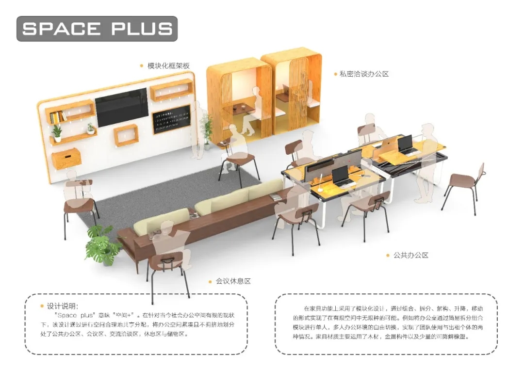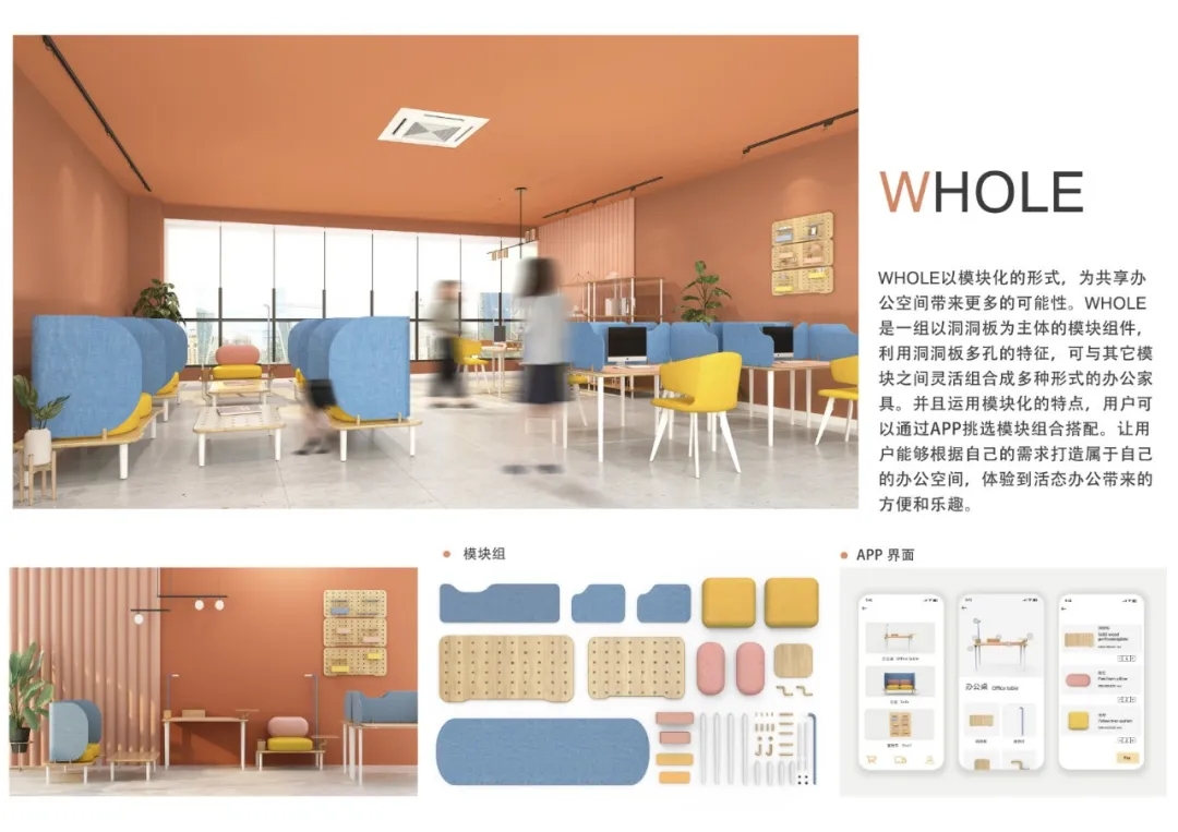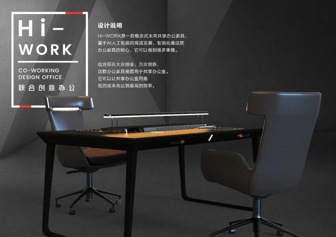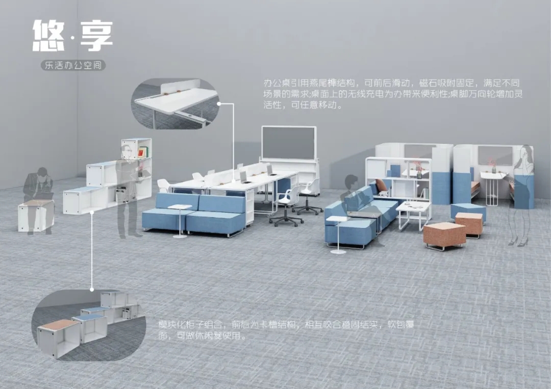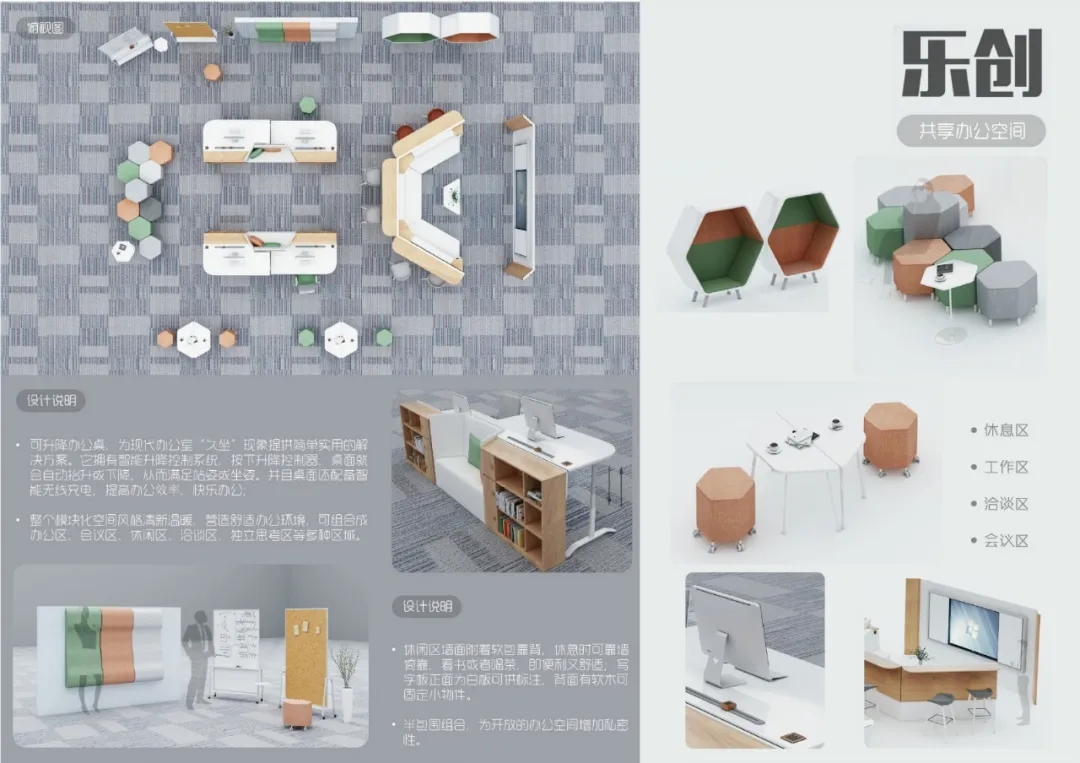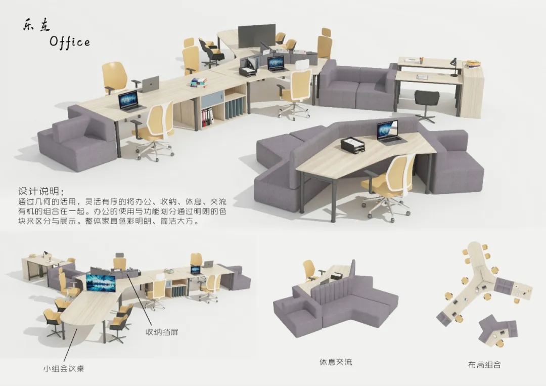 作品的策劃與大賽主題的整體關(guān)系,有清晰的創(chuàng)作概念示意圖,滿足共享辦公需求的辦公家具設(shè)計(jì)作品。